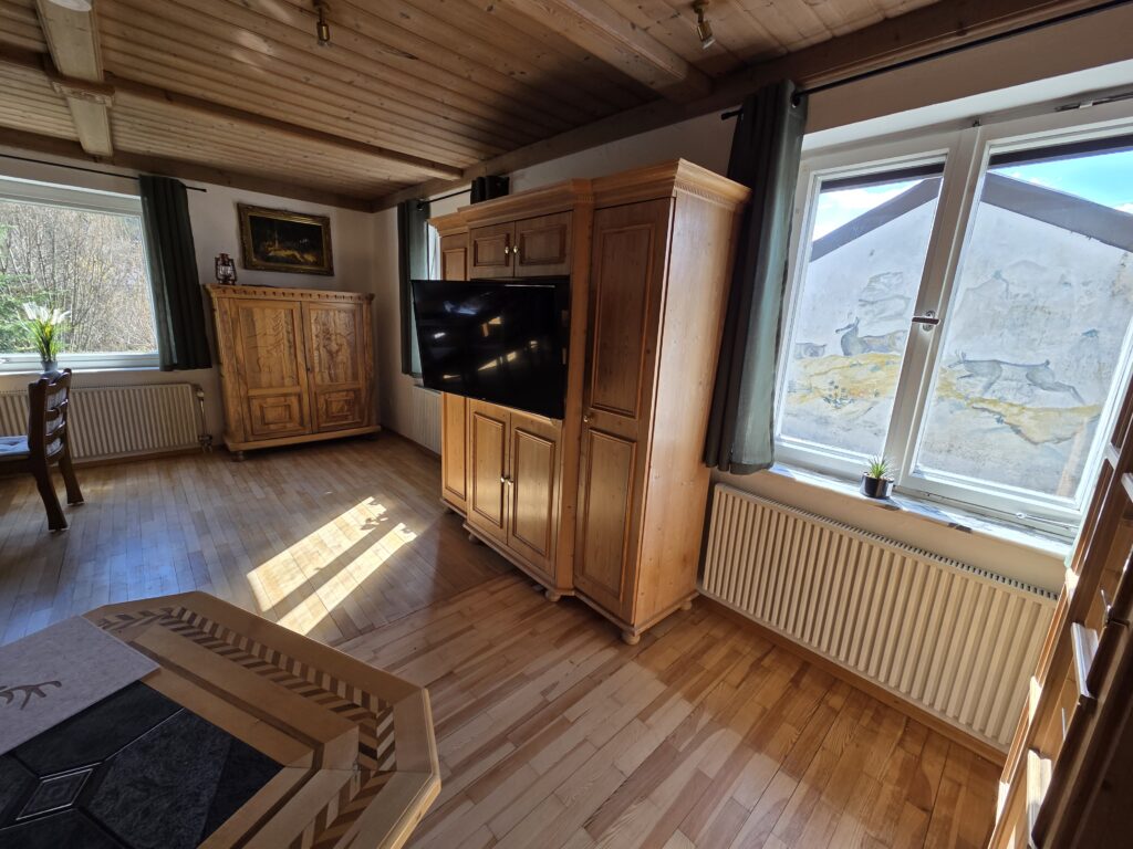 Mit TV, Esstisch und Schlafsofa.
